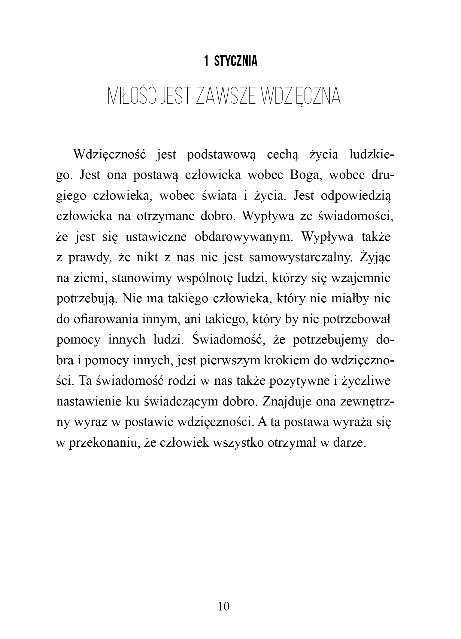 Dziękując, zaczynamy widzieć życie innymi oczami. Wdzięczność chroni przed małodusznością, zgorzknieniem i pesymizmem. Jest antidotum na narzekanie i malkontenctwo. Sprawia, że stajemy się pełni radości, energii i chęci do życia. Dzięki wdzięczności nasze życie staje się bogatsze i piękniejsze.