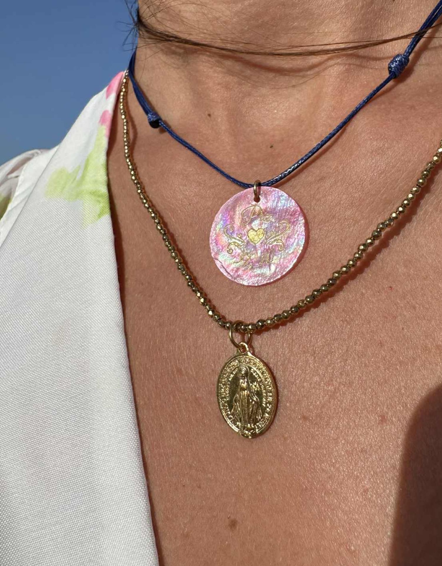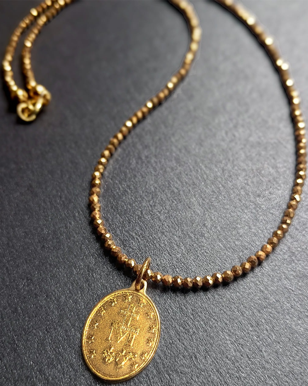 Nasz naszyjnik z Cudownym Medalikiem wykonany został ze srebra pozłacanego próby 925, wolnego od niklu, z subtelnym medalikiem (14×18 mm) oraz drobnymi, fasetowanymi koralikami z hematytu w kolorze złotym (2 mm). To wyjątkowa biżuteria, łącząca piękno z duchowym przesłaniem.
