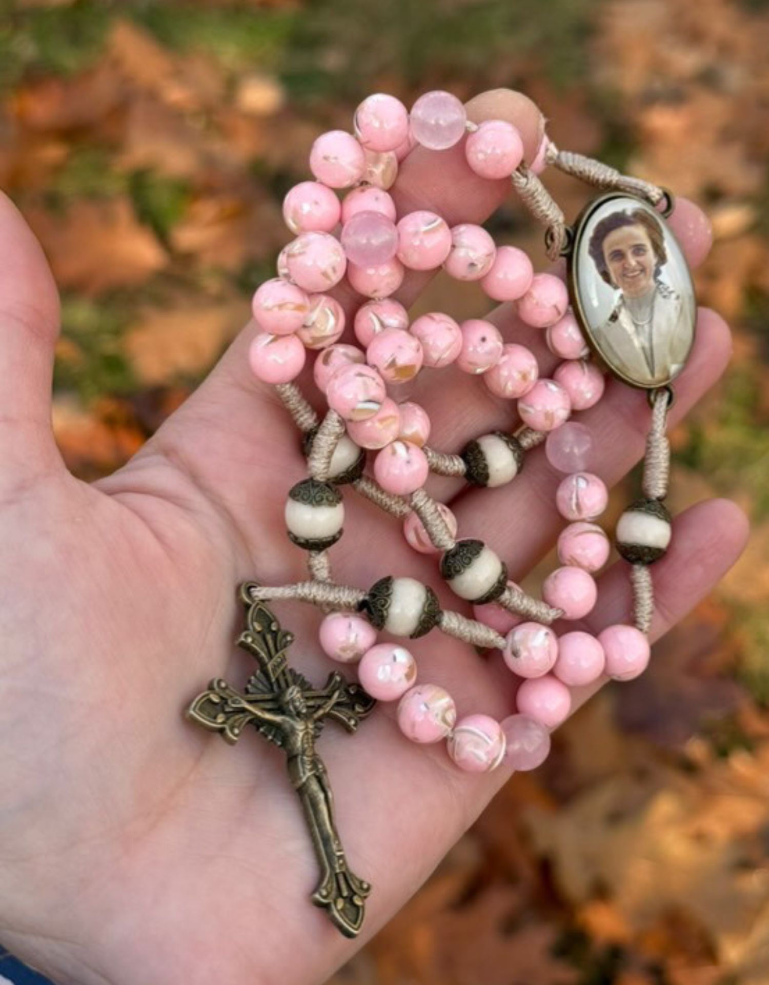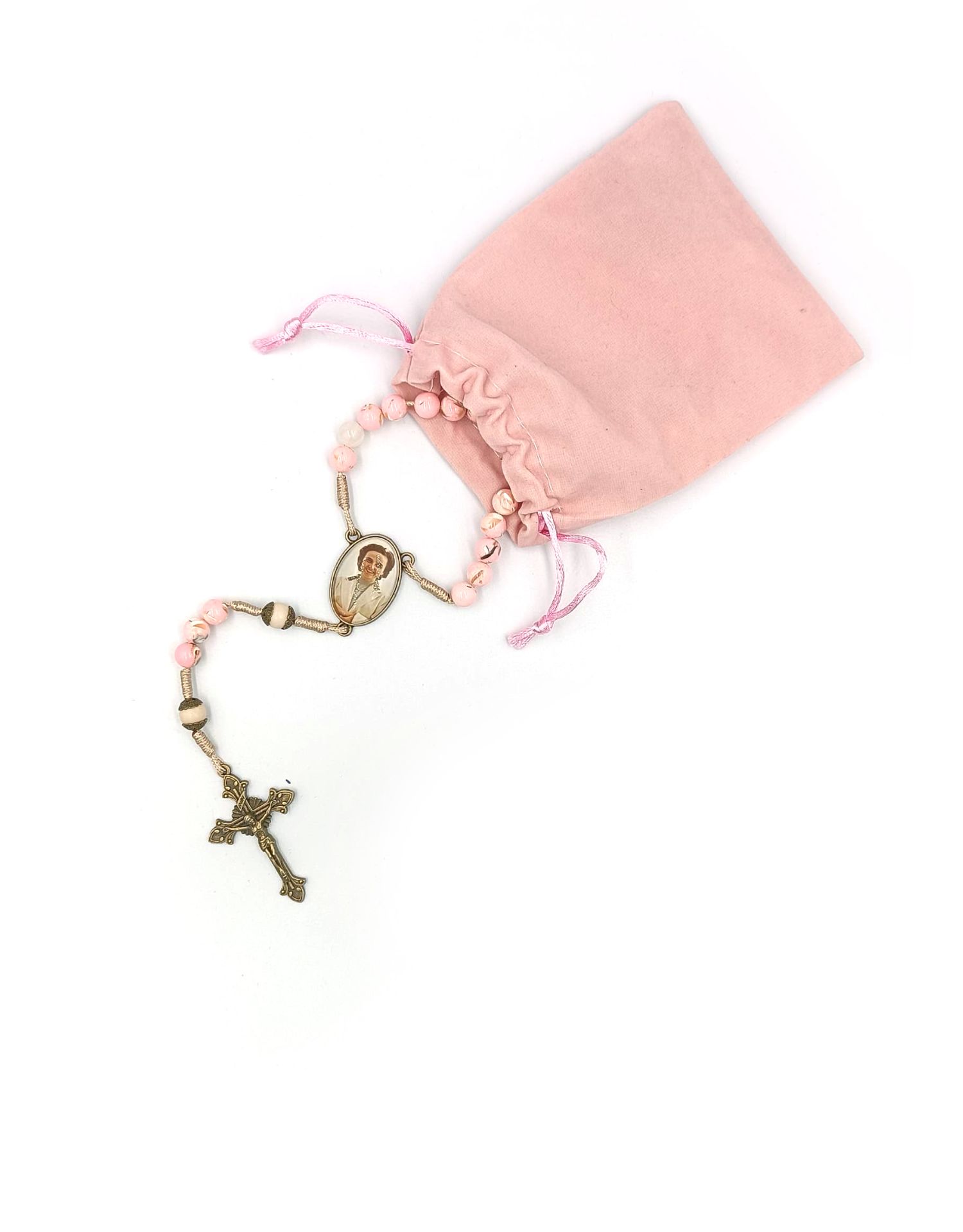 Sercem różańca jest ręcznie wykonany łącznik z wizerunkiem św. Joanny Beretty Molli – lekarki, żony i matki, której życie stało się ikoną miłości, ofiarności i odwagi. Jej przykład przypomina, że świętość można realizować w codzienności, w rodzinie, w pracy i w trosce o drugiego człowieka.